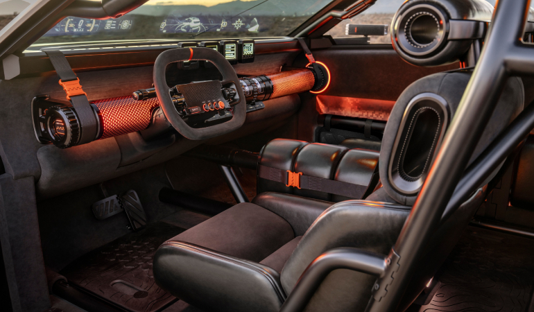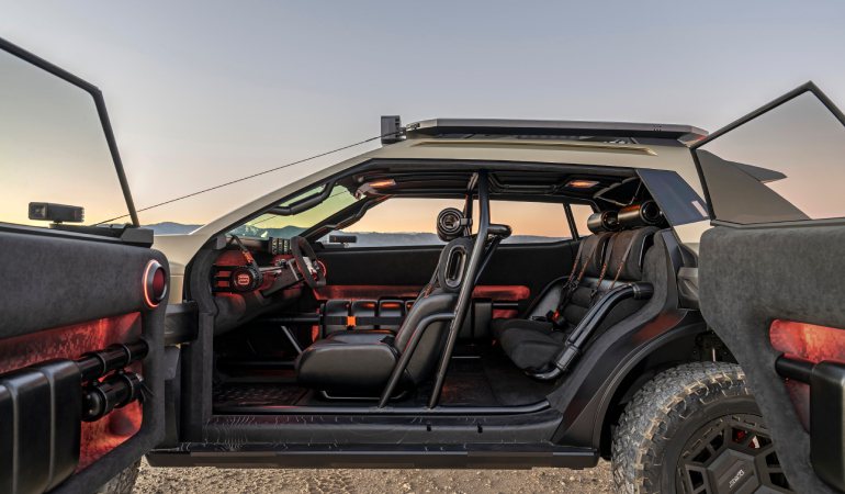 CRATER Concept’in iç tasarımı, teknolojiye meraklı ve maceracı kullanıcılar için fonksiyon odaklı olarak kurgulandı. Yumuşak ancak dayanıklı malzemeler, sert yapısal detaylarla bir araya getirilerek hem konfor hem de dayanıklılık sağlanıyor. Kabin içinde açıkta bırakılmış takla kafesi, bütünleşmiş tutma kolları ve dört noktalı emniyet kemeri gibi unsurlar güvenli keşif hissini güçlendiriyor.