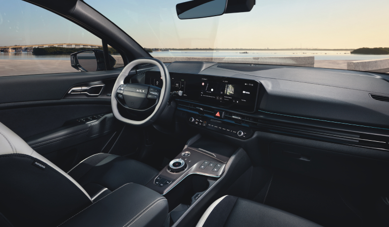 İç mekânda ferah ve konforlu bir yaşam alanı sunan Yeni Sportage, GT-Line donanımında çift renkli deri direksiyon simidi ve sadeleştirilmiş gösterge paneliyle modern bir tasarım anlayışını yansıtıyor. Yeni koltuk döşemeleri konforu artırırken, GT-Line’a özel dekoratif süet deri koltuklar şıklığı ön plana çıkarıyor.